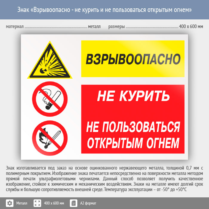 Знак «Взрывоопасно - не курить и не пользоваться открытым огнем», КЗ-09 (металл, 600х400 мм) в Кашире купить