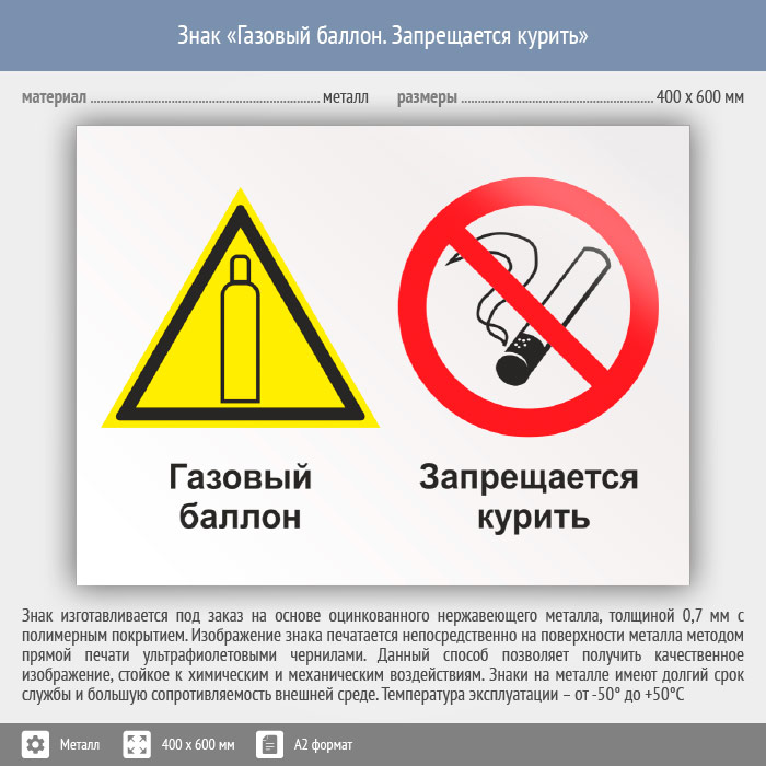 Знак «Газовый баллон. Запрещается курить», КЗ-18 (металл, 600х400 мм) в Кашире купить