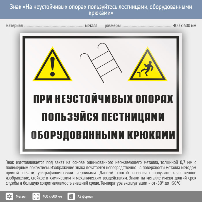 Знак «На неустойчивых опорах пользуйтесь лестницами, оборудованными крюками», КЗ-22 (металл, 600х400 мм) в Кашире купить