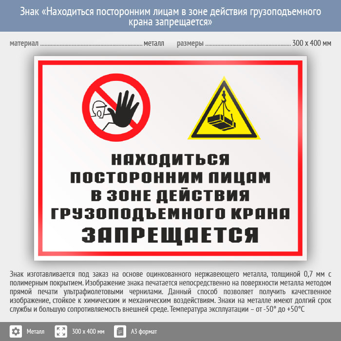 Знак «Находиться посторонним лицам в зоне действия грузоподъемного крана запрещается», КЗ-23 (металл, 400х300 мм) в Кашире купить