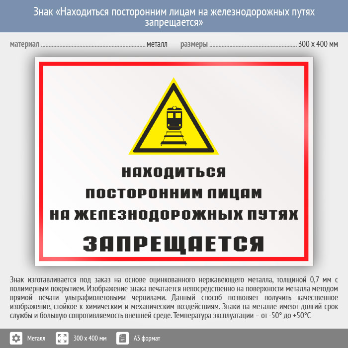 Знак «Находиться посторонним лицам на железнодорожных путях запрещается», КЗ-24 (металл, 400х300 мм) в Кашире купить