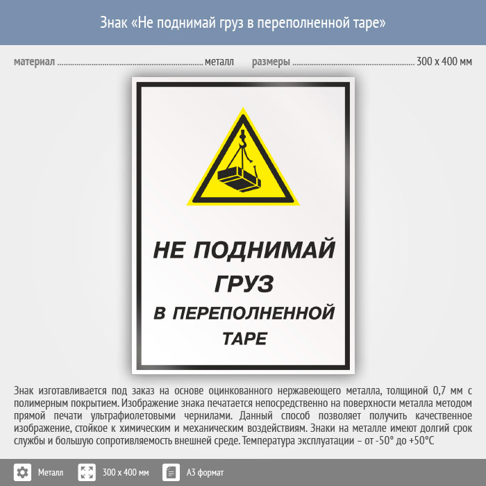 Знак «Не поднимай груз в переполненной таре», КЗ-26 (металл, 300х400 мм) в Кашире купить