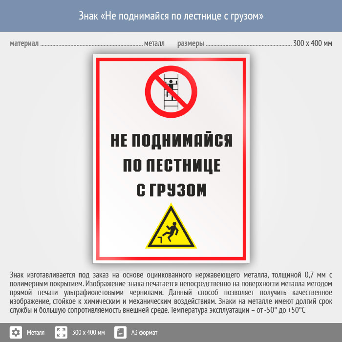 Знак «Не поднимайся по лестнице с грузом», КЗ-28 (металл, 300х400 мм) в Кашире купить