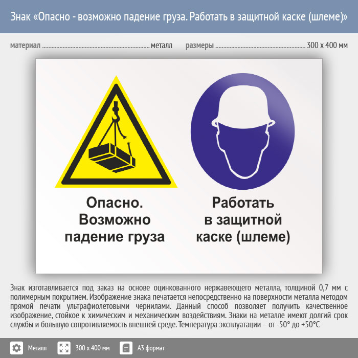 Знак «Опасно - возможно падение груза. Работать в защитной каске (шлеме)», КЗ-34 (металл, 400х300 мм) в Кашире купить