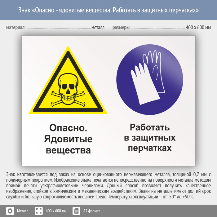 Знак «Опасно - ядовитые вещества. Работать в защитных перчатках», КЗ-43 (металл, 600х400 мм) в Кашире купить