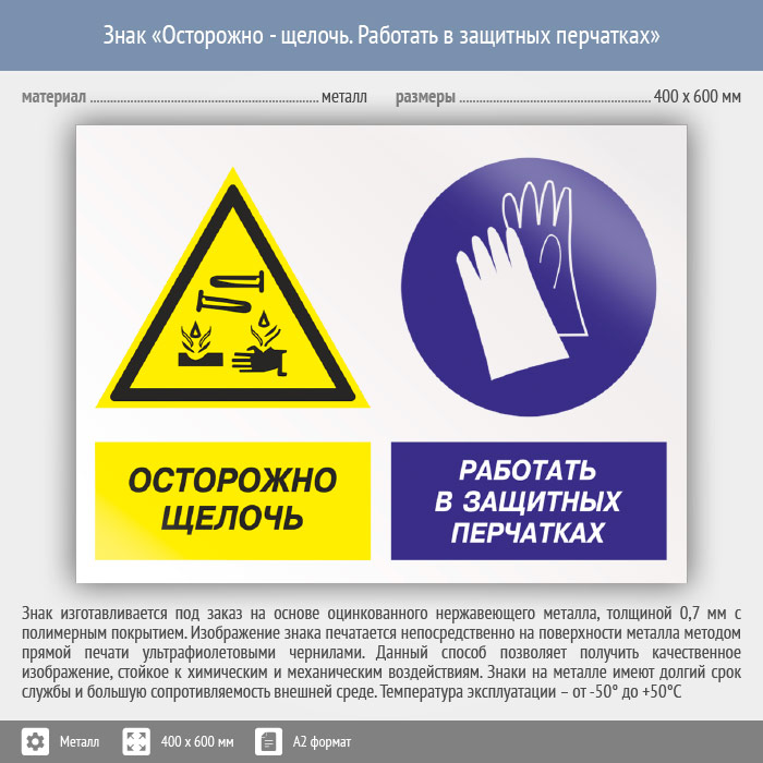 Знак «Осторожно - щелочь. Работать в защитных перчатках», КЗ-60 (металл, 600х400 мм) в Кашире купить