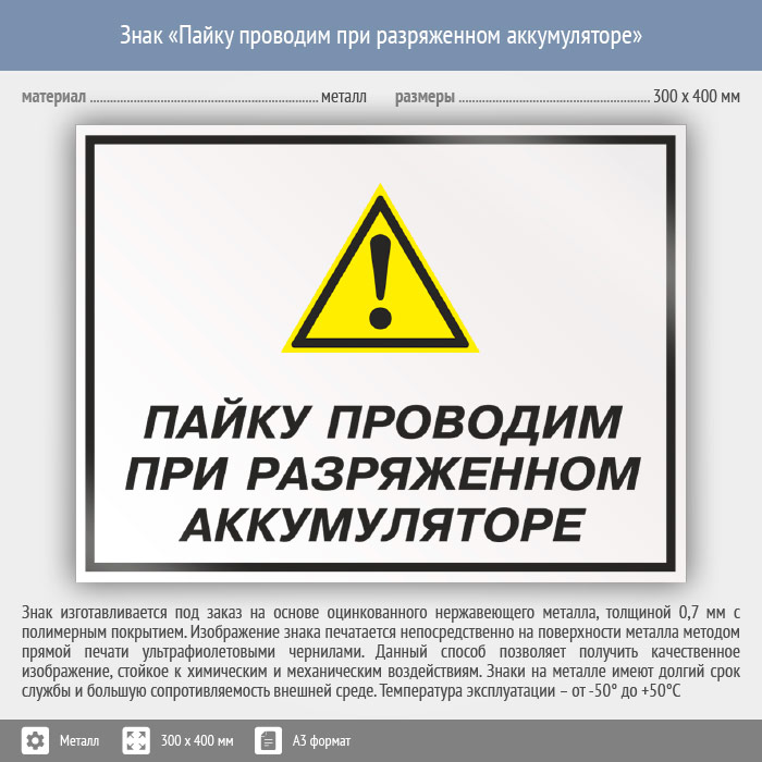 Знак «Пайку проводим при разряженном аккумуляторе», КЗ-62 (металл, 400х300 мм) в Кашире купить