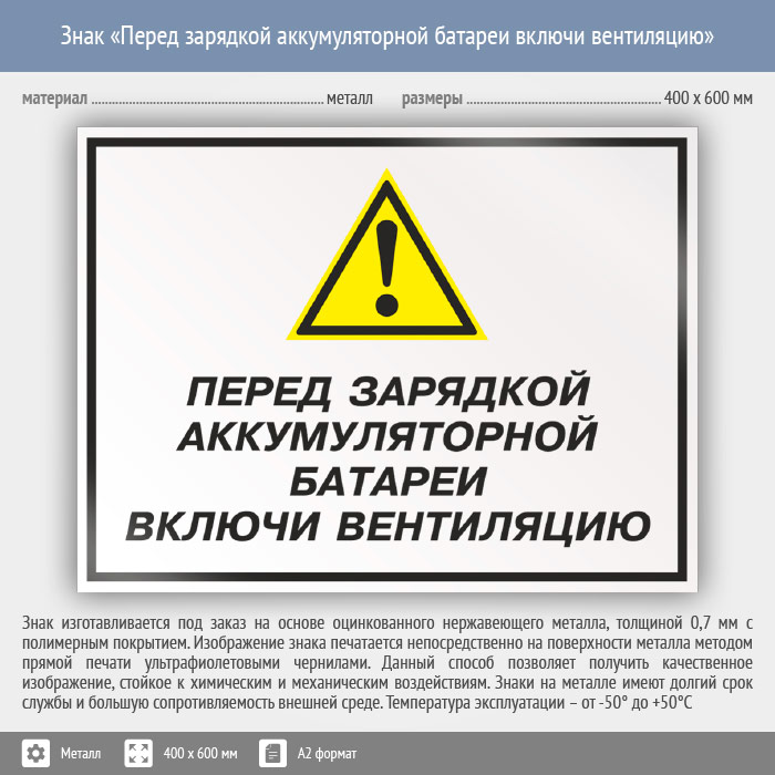 Знак «Перед зарядкой аккумуляторной батареи включи вентиляцию», КЗ-63 (металл, 600х400 мм) в Кашире купить