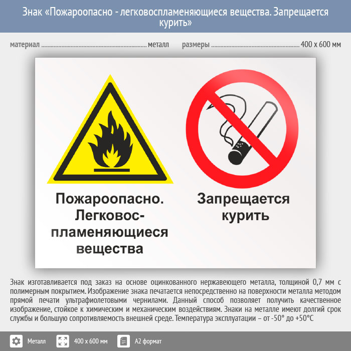 Знак «Пожароопасно - легковоспламеняющиеся вещества. Запрещается курить», КЗ-69 (металл, 600х400 мм) в Кашире купить