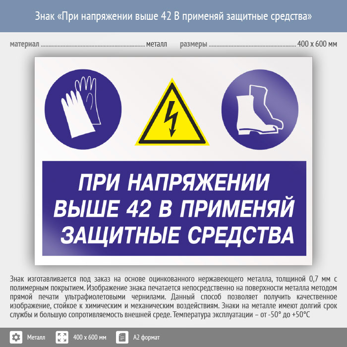 Знак «При напряжении выше 42 В применяй защитные средства», КЗ-72 (металл, 600х400 мм) в Кашире купить