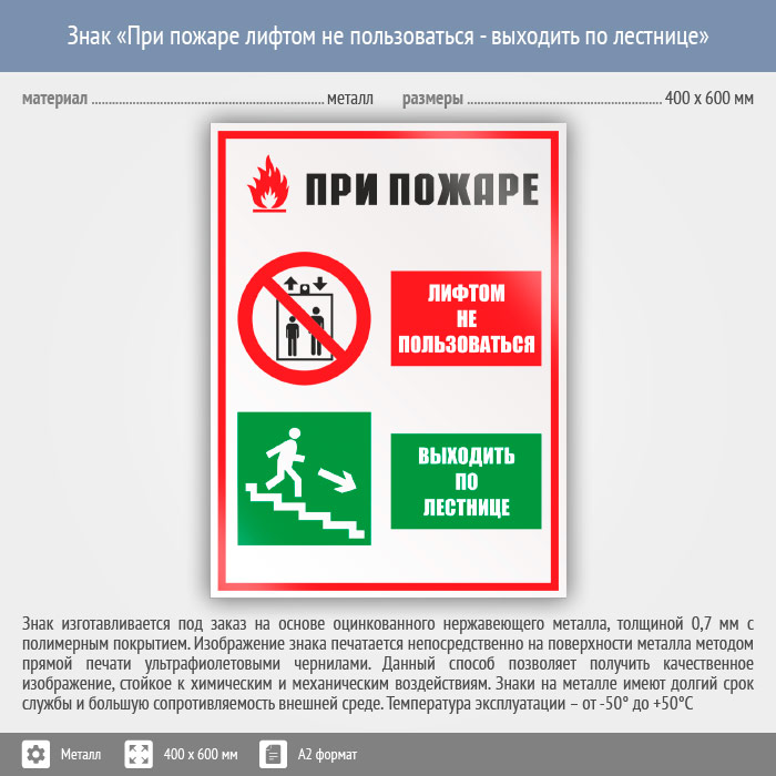 Знак «При пожаре лифтом не пользоваться - выходить по лестнице», КЗ-73 (металл, 400х600 мм) в Кашире купить