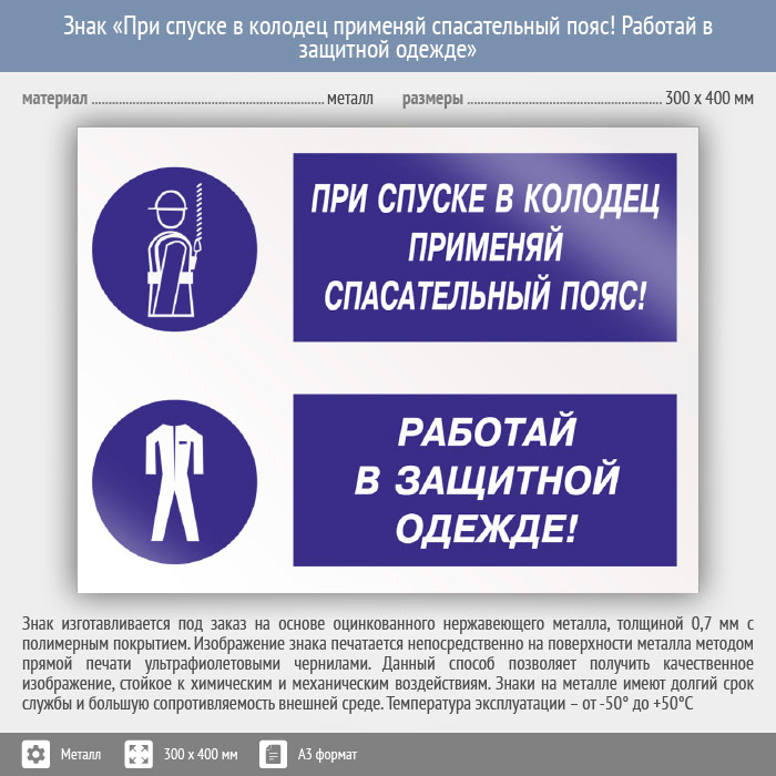 Знак «При спуске в колодец применяй спасательный пояс! Работай в защитной одежде», КЗ-76 (металл, 400х300 мм) в Кашире купить