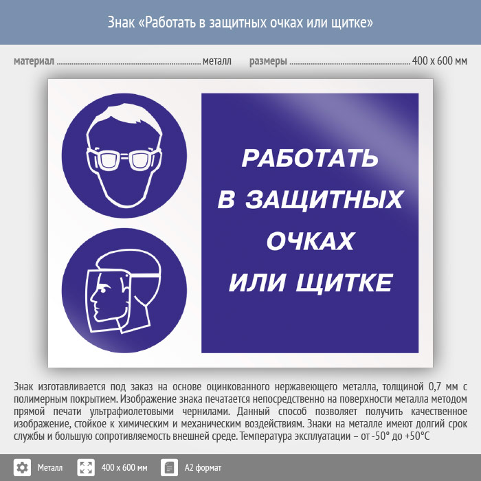 Знак «Работать в защитных очках или щитке», КЗ-80 (металл, 600х400 мм) в Кашире купить