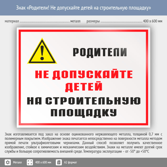 Знак «Родители! Не допускайте детей на строительную площадку», КЗ-84 (металл, 600х400 мм) в Кашире купить