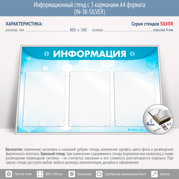 Информационный стенд с 3 карманами А4 формата (IN-3K-SILVER) в Кашире купить