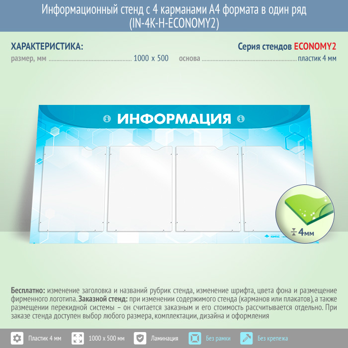 Информационный стенд с 4 карманами А4 формата в один ряд (IN-4K-H-ECONOMY2) в Кашире купить