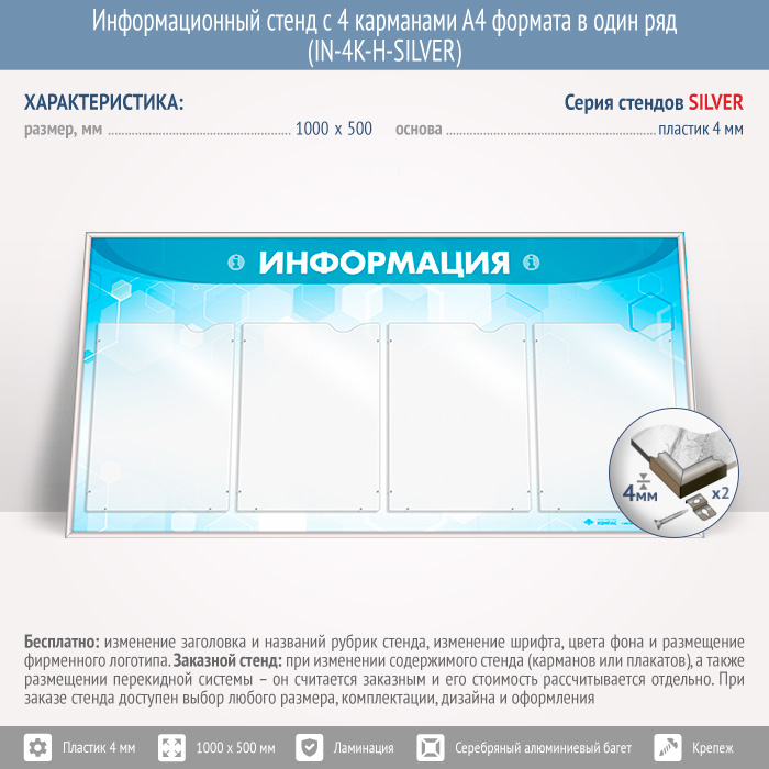 Информационный стенд с 4 карманами А4 формата в один ряд (IN-4K-H-SILVER) в Кашире купить