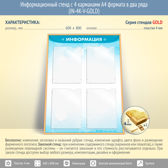 Информационный стенд с 4 карманами А4 формата в два ряда (IN-4K-V-GOLD) в Кашире купить