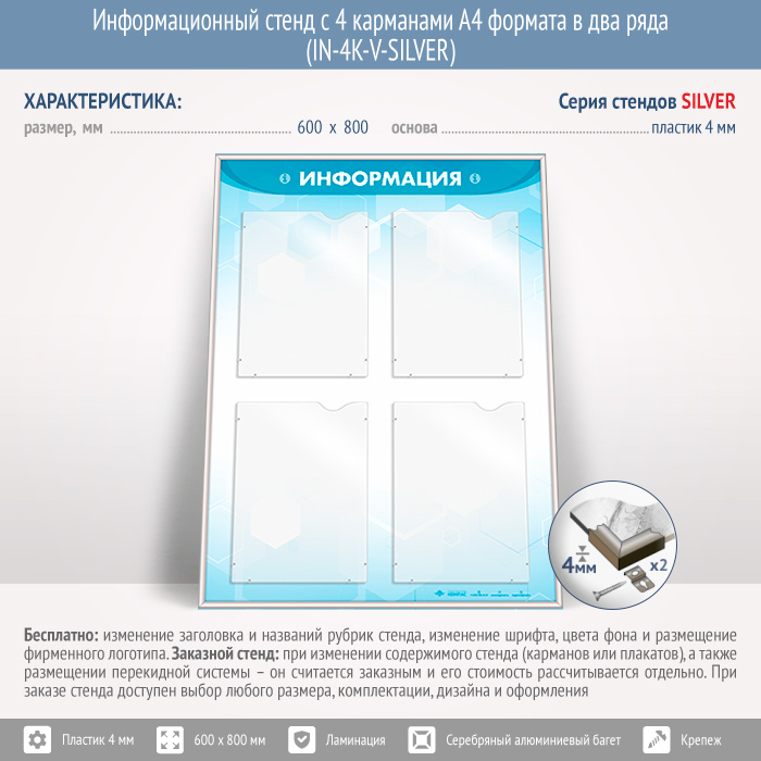 Информационный стенд с 4 карманами А4 формата в два ряда (IN-4K-V-SILVER) в Кашире купить