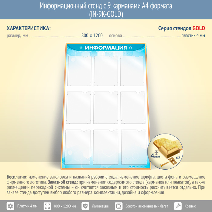 Информационный стенд с 9 карманами А4 формата (IN-9K-GOLD) в Кашире купить