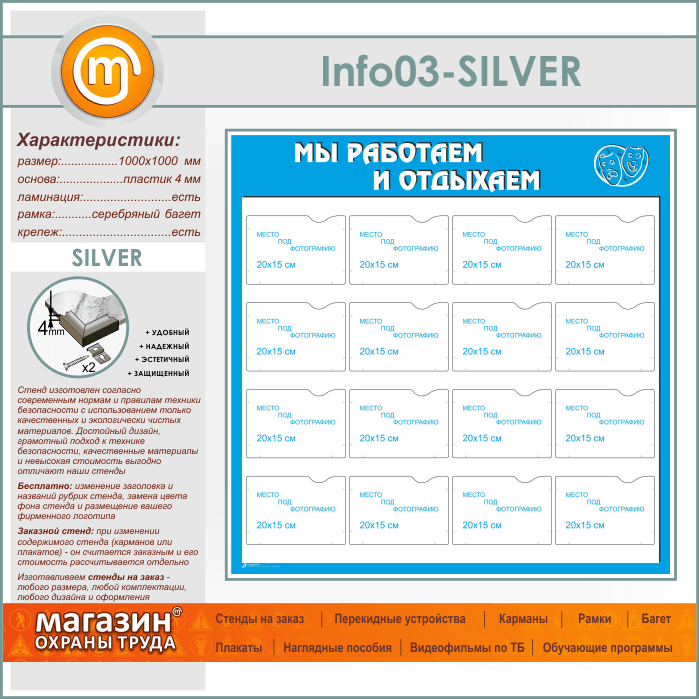 Стенд «Мы работаем и отдыхаем» с 16 карманами А5 формата (IN-03-SILVER) в Кашире купить