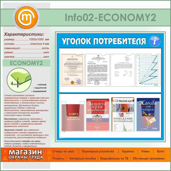 Стенд «Уголок потребителя» с 4 плоскими и 4 объемными карманами А4 формата (IN-02-ECONOMY2) в Кашире купить