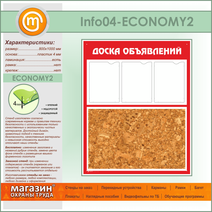 Стенд «Доска объявлений» с пробковым полотном и 3 карманами А4 формата (IN-04-ECONOMY2) в Кашире купить