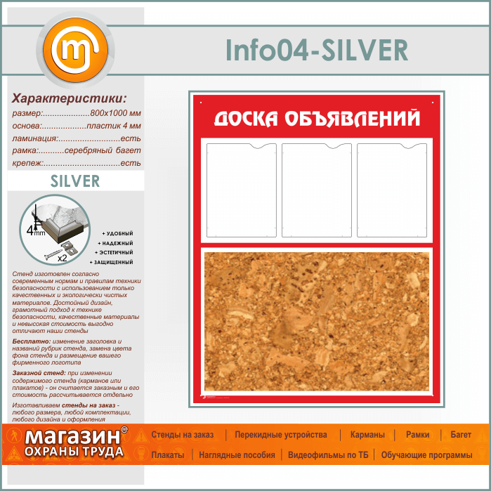 Стенд «Доска объявлений» с пробковым полотном и 3 карманами А4 формата (IN-04-SILVER) в Кашире купить