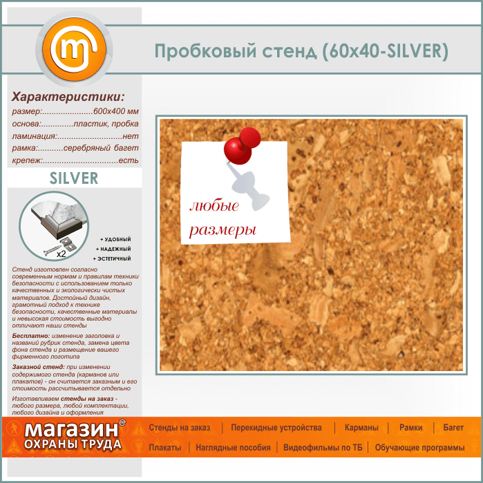 Пробковая доска, 60х40 см (IN-05-SILVER) в Кашире купить