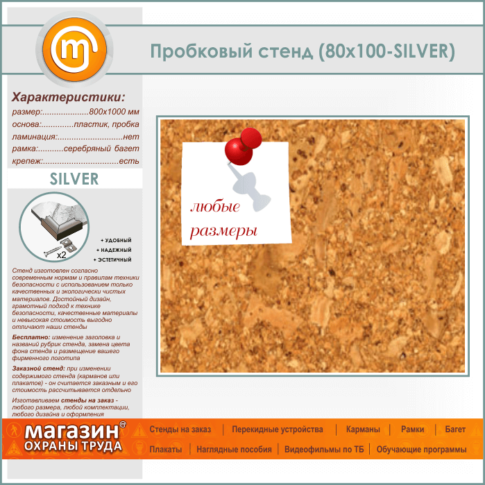Пробковая доска, 100х80 см (IN-05-SILVER) в Кашире купить