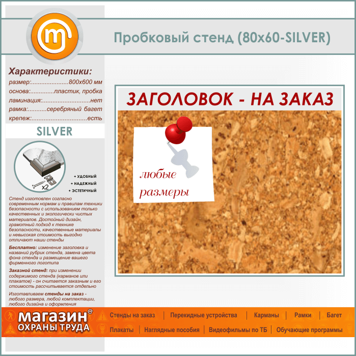 Пробковая доска с заголовком, 80х60 см (IN-06-SILVER) в Кашире купить