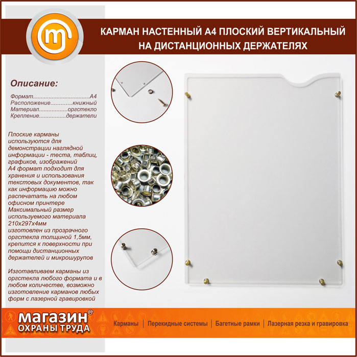 Карман настенный А4 плоский вертикальный на дистанционных держателях в Кашире купить