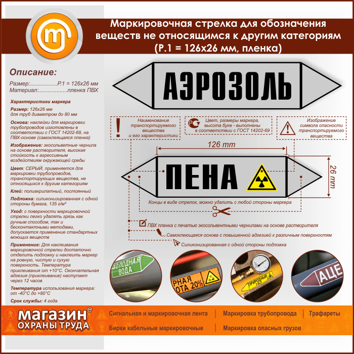 Самоклеящиеся маркеры «ПРОЧИЕ ВЕЩЕСТВА» имеют СЕРЫЙ цвет, который применяется для маркировки трубопроводов, транспортирующих вещества, не относящиеся к другим категориям. Наклейки представлены во всех типоразмерах (Р.1-P.5) и изготовлены в соответствии с ГОСТ 14202-69 на самоклеящейся плёнке с ламинацией и без
