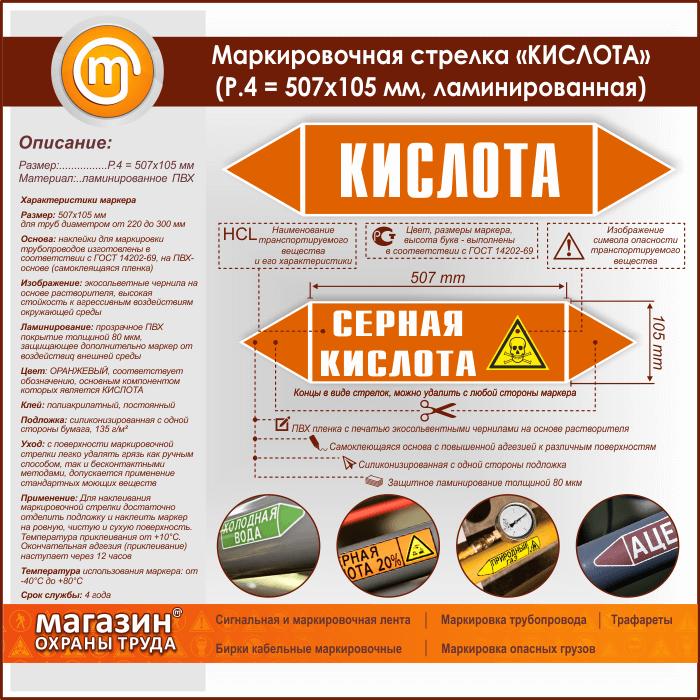 Маркировочная стрелка «КИСЛОТА» (P.4 = 507х105 мм, самоклеящаяся плёнка с ламинированием) в Кашире купить