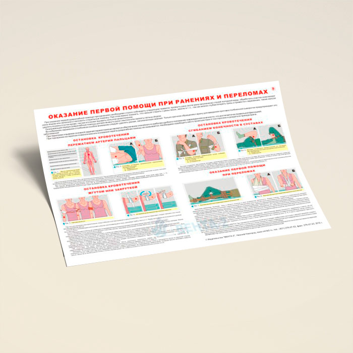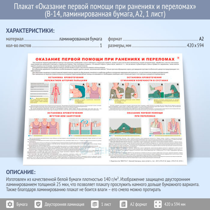 Плакат «Оказание первой помощи при ранениях и переломах» (В-14, ламинированная бумага, А2, 1 лист) в Кашире купить