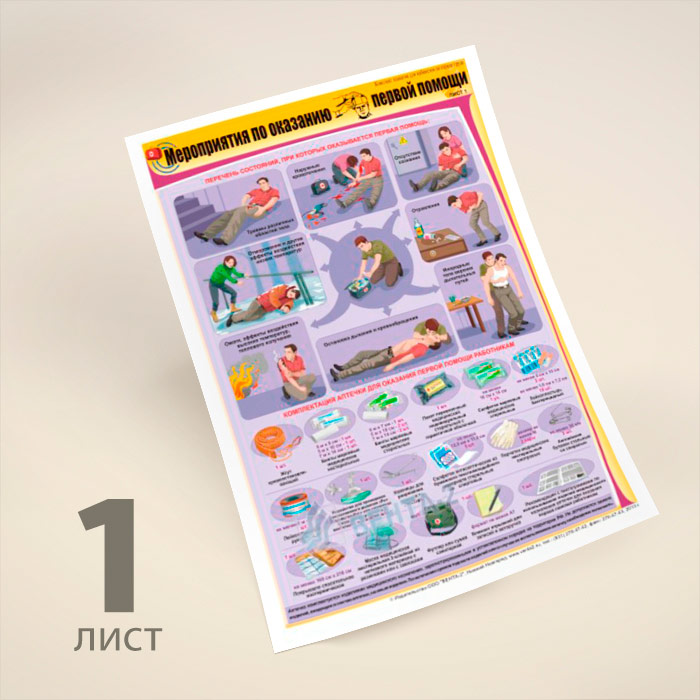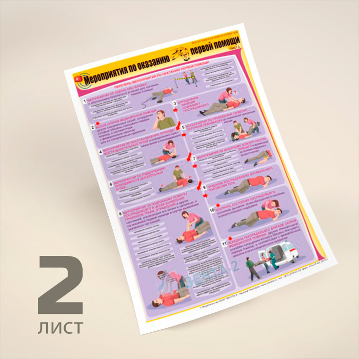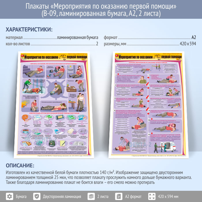 Плакаты «Мероприятия по оказанию первой помощи» (В-09, ламинированная бумага, А2, 2 листа) в Кашире купить