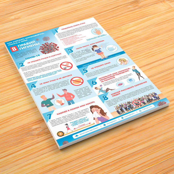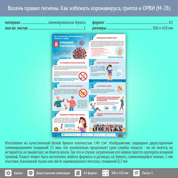 Плакат «Восемь правил гигиены. Как избежать коронавируса, гриппа и ОРВИ» (М-28, ламинированная бумага, А3, 1 лист) в Кашире купить