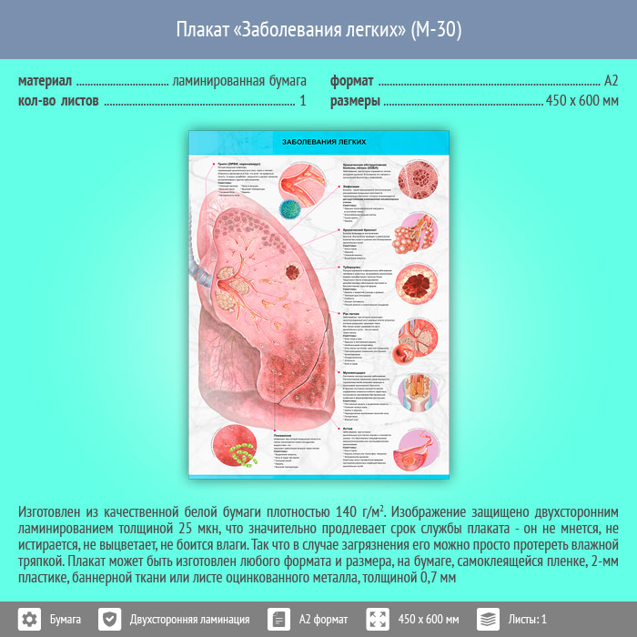 Плакат «Заболевания легких» (М-30, ламинированная бумага, А2, 1 лист) в Кашире купить