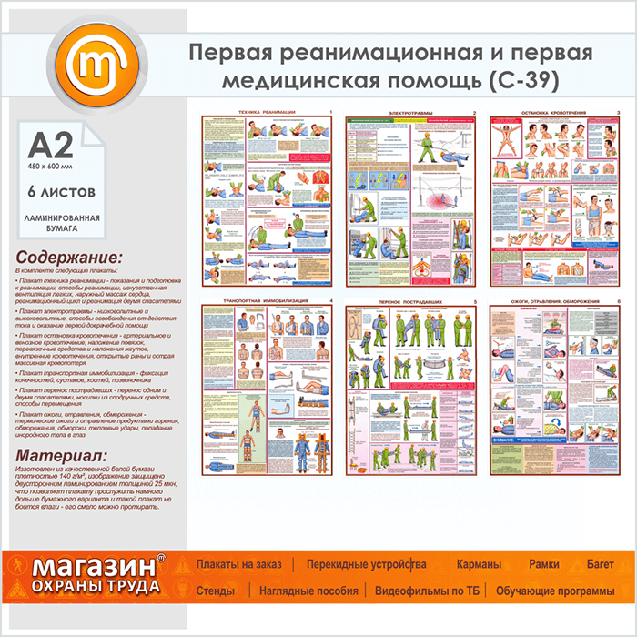 Плакат «Оказание первой помощи пострадавшим» (С-39, ламинированная бумага, А2, 6 листов) в Кашире купить
