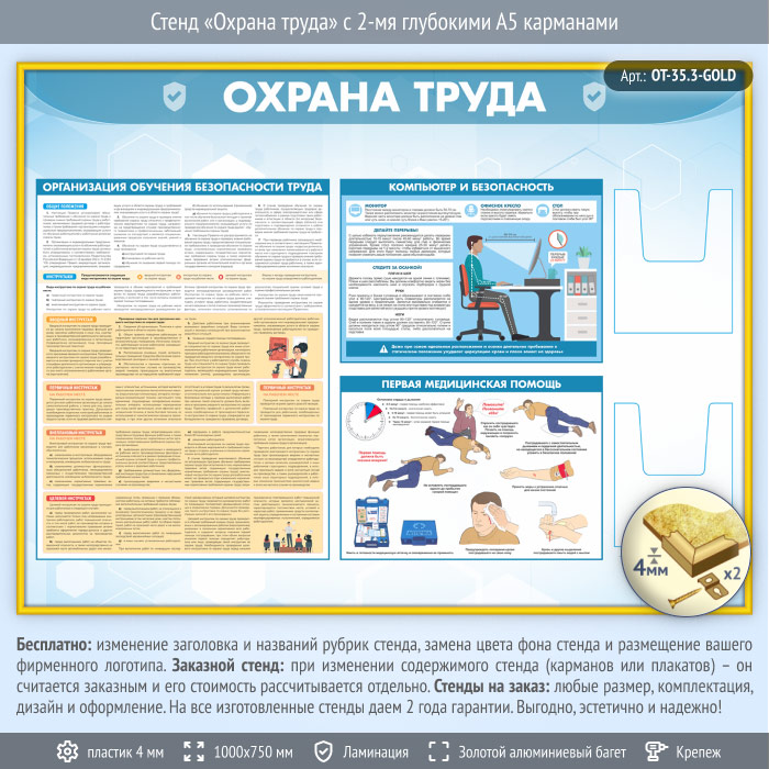 Стенд «Охрана труда» с 2-мя глубокими А5 карманами (OT-35.3-GOLD) в Кашире купить
