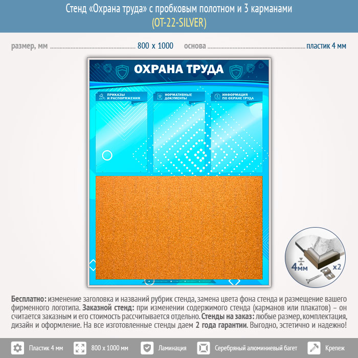 Стенд «Охрана труда» с пробковым полотном и 3 карманами (OT-22-SILVER) в Кашире купить