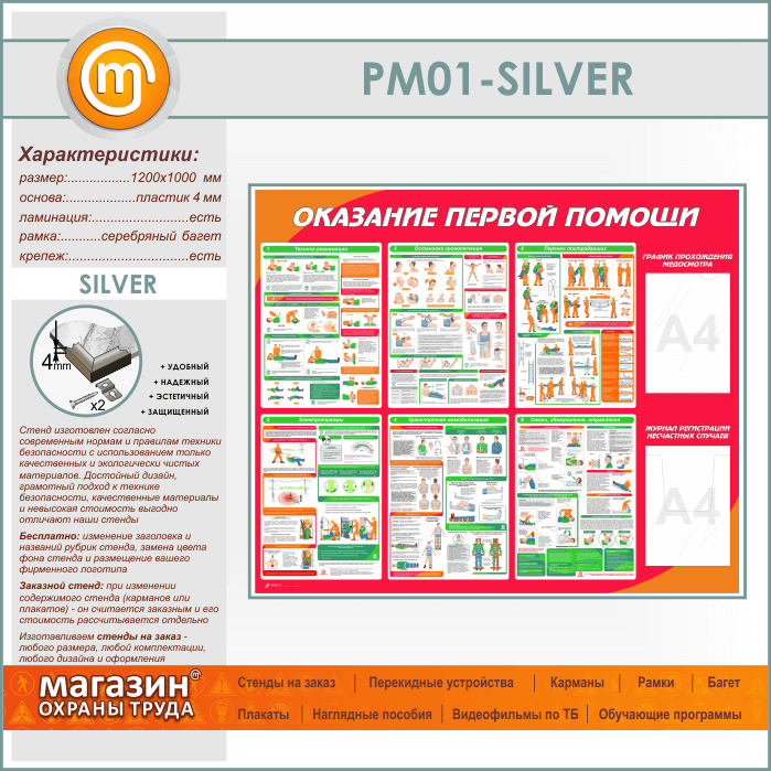Стенд «Оказание первой помощи» с плоским и объемным карманами (PM-01-SILVER) в Кашире купить