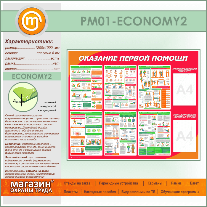 Стенд «Оказание первой помощи» с плоским и объемным карманами (PM-01-ECONOMY2) в Кашире купить