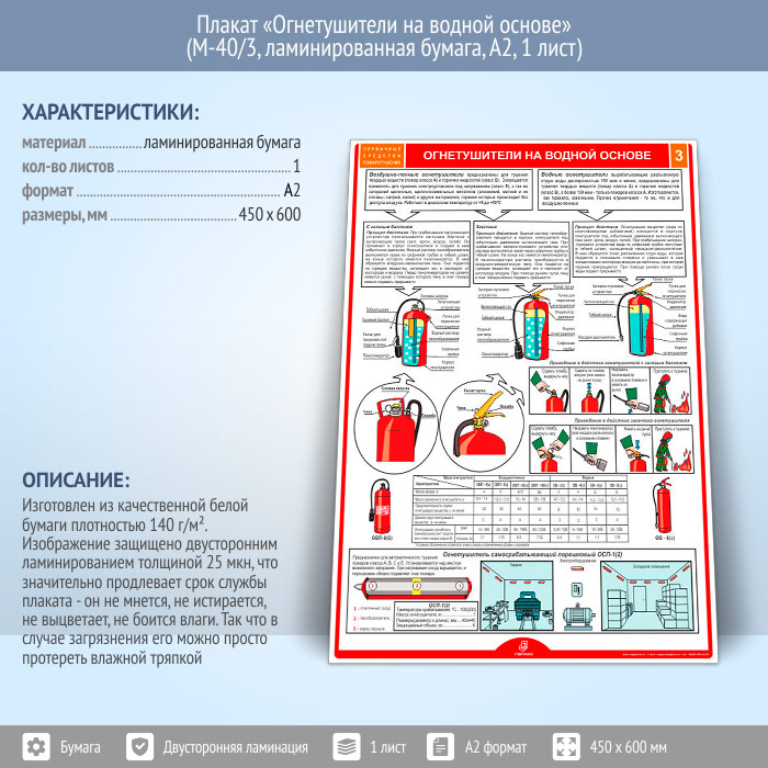 Плакат «Огнетушители на водной основе» (М-40/3, ламинированная бумага, А2, 1 лист) в Кашире купить
