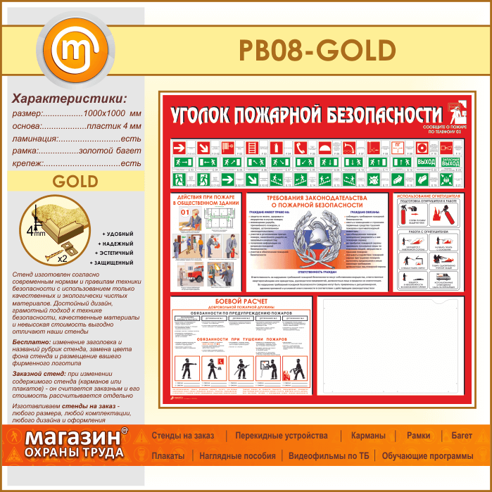 Стенд «Уголок пожарной безопасности» с карманом А3 формата (PB-08-GOLD) в Кашире купить