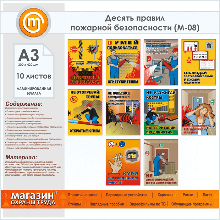 Плакаты «Десять правил пожарной безопасности» (М-08, ламинированная бумага, А3, 10 листов) в Кашире купить