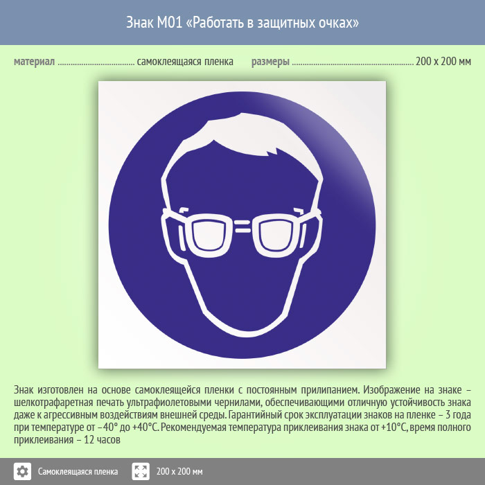 Знак M01 «Работать в защитных очках» (пленка, 200х200 мм) в Кашире купить
