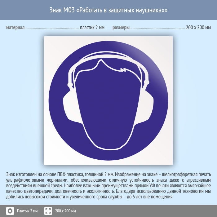 Знак M03 «Работать в защитных наушниках» (пластик, 200х200 мм) в Кашире купить