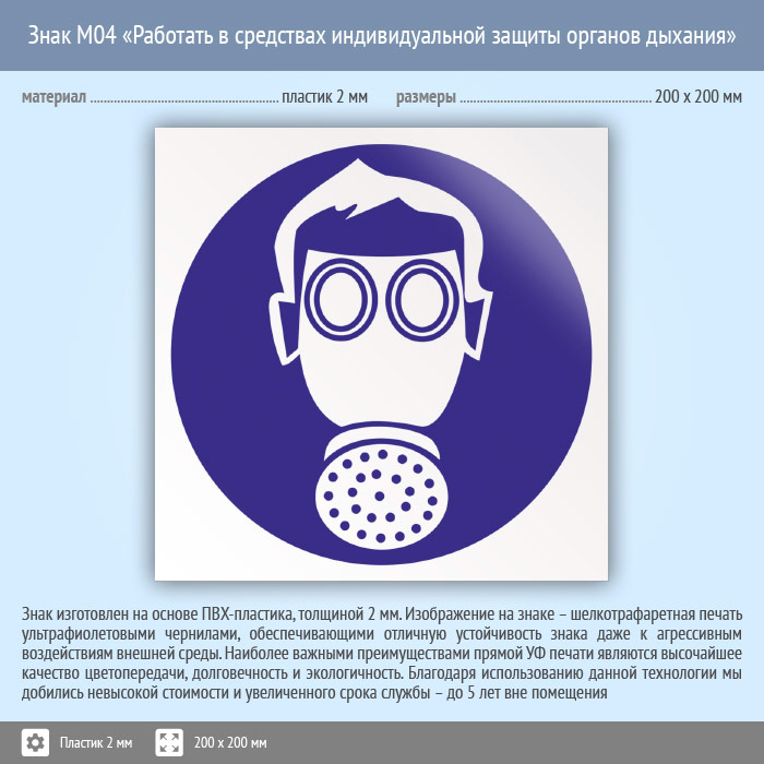 Знак M04 «Работать в средствах индивидуальной защиты органов дыхания» (пластик, 200х200 мм) в Кашире купить