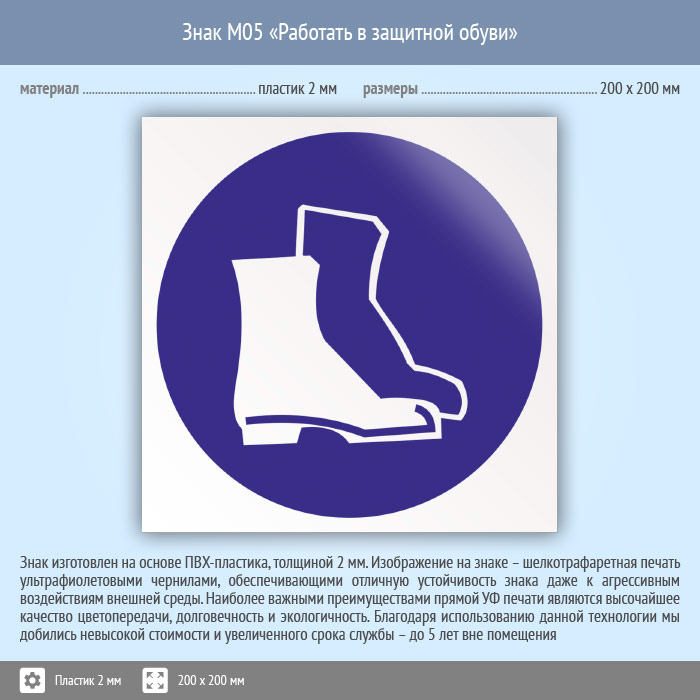 Знак M05 «Работать в защитной обуви» (пластик, 200х200 мм) в Кашире купить